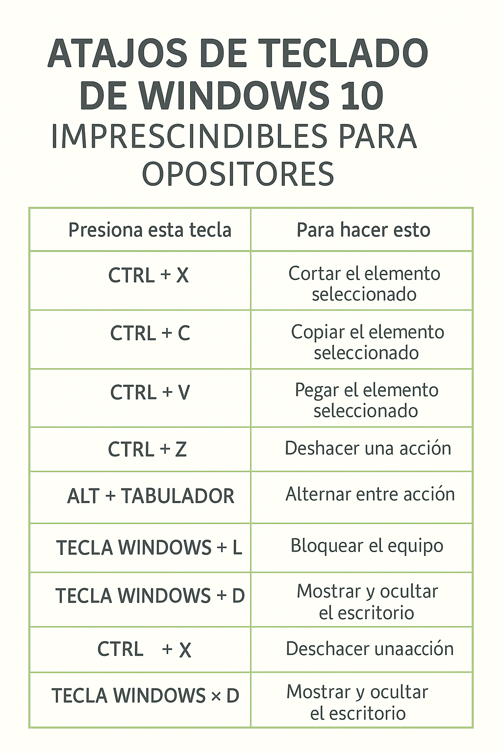 Si estás preparando oposiciones y necesitas memorizar los atajos de teclado más importantes de Windows 10, este recurso es para ti. A continuación te mostramos una lista completa y actualizada de métodos abreviados de teclado organizados por categorías, especialmente útil para quienes preparan exámenes oficiales. Además, puedes descargar los atajos de teclado Windows 10 en PDF, ideal para llevar siempre contigo.